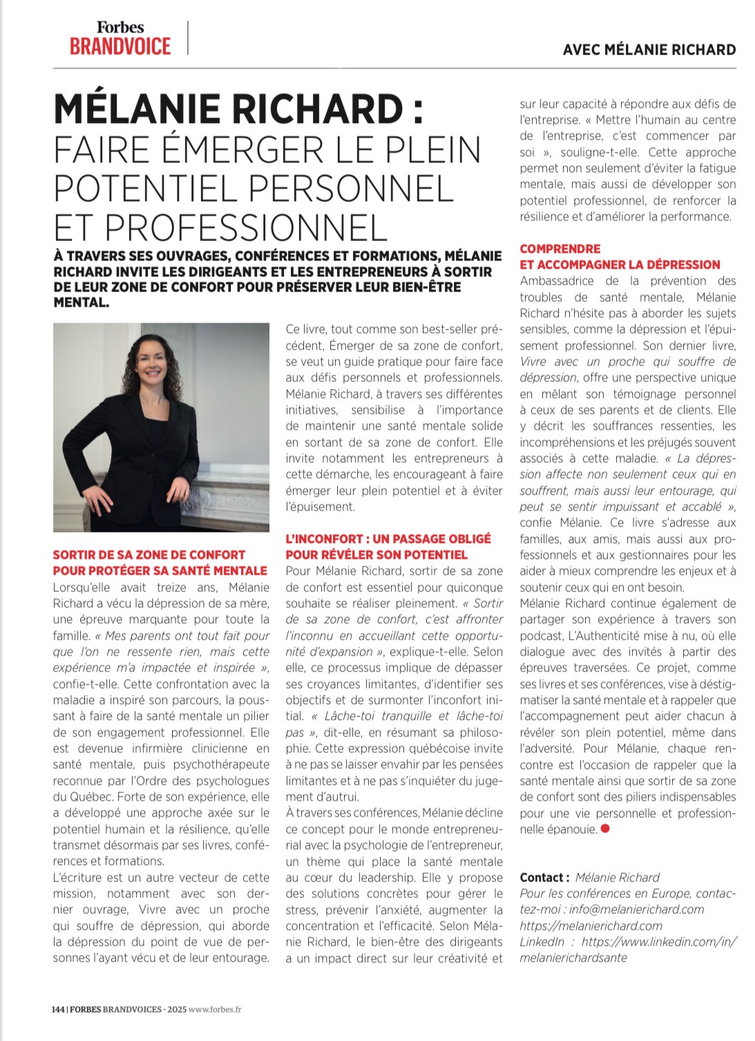 Ensuite, cela a été une magnifique surprise d’être interviewée pour la rédaction d’un article dans la magazine Forbes, dans le cadre du leadership au féminin. Jamais je n’aurais pensé vivre tous ces moments et rencontrer autant de gens extraordinaires à travers ces événements. Je suis reconnaissantes et cela m’encourage de continuer à sortir de ma zone de confort. Puisque, ce qui m’allume le plus dans la vie est d’avoir un impact dans la vie des gens en les voyant vibrer tout en rappelant qui ils sont vraiment dans leur unicité. Leur permettre de faire émerger leur plein potentiel et savourer pleinement la vie! Cela permet par la fait même de s’éloigner des troubles en santé mentale et s’épanouir! Donc, me sortir de ma zone de confort engendre des événements me permettant d’aider encore plus de personnes!